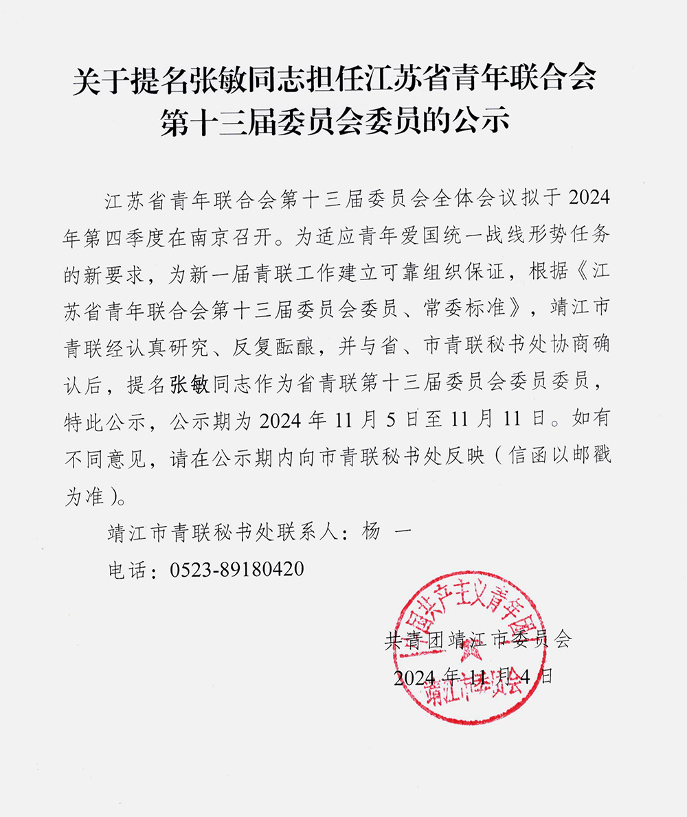 江蘇省青年聯(lián)合會第十三屆委員會全體會議擬于2024年第四季度在南京召開。為適應(yīng)青年愛國統(tǒng)一戰(zhàn)線形勢任務(wù)的新要求,為新一屆青聯(lián)工作建立可靠組織保證,根據(jù)《江蘇省青年聯(lián)合會第十三屆委員會委員、常委標(biāo)準(zhǔn)》,靖江市青聯(lián)經(jīng)認(rèn)真研究、反復(fù)醞釀,并與省、市青聯(lián)秘書處協(xié)商確認(rèn)后,提名張敏同志作為省青聯(lián)第十三屆委員會委員委員,特此公示